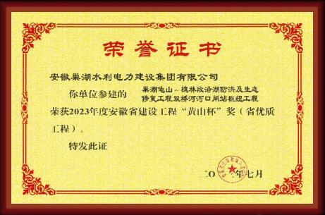 “黃山杯”榮譽證書