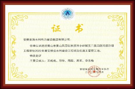 黃山市黃山風景區秧溪河小嶺腳至三溪河口段河道治理工程榮獲“規范化施工管理工地”證書