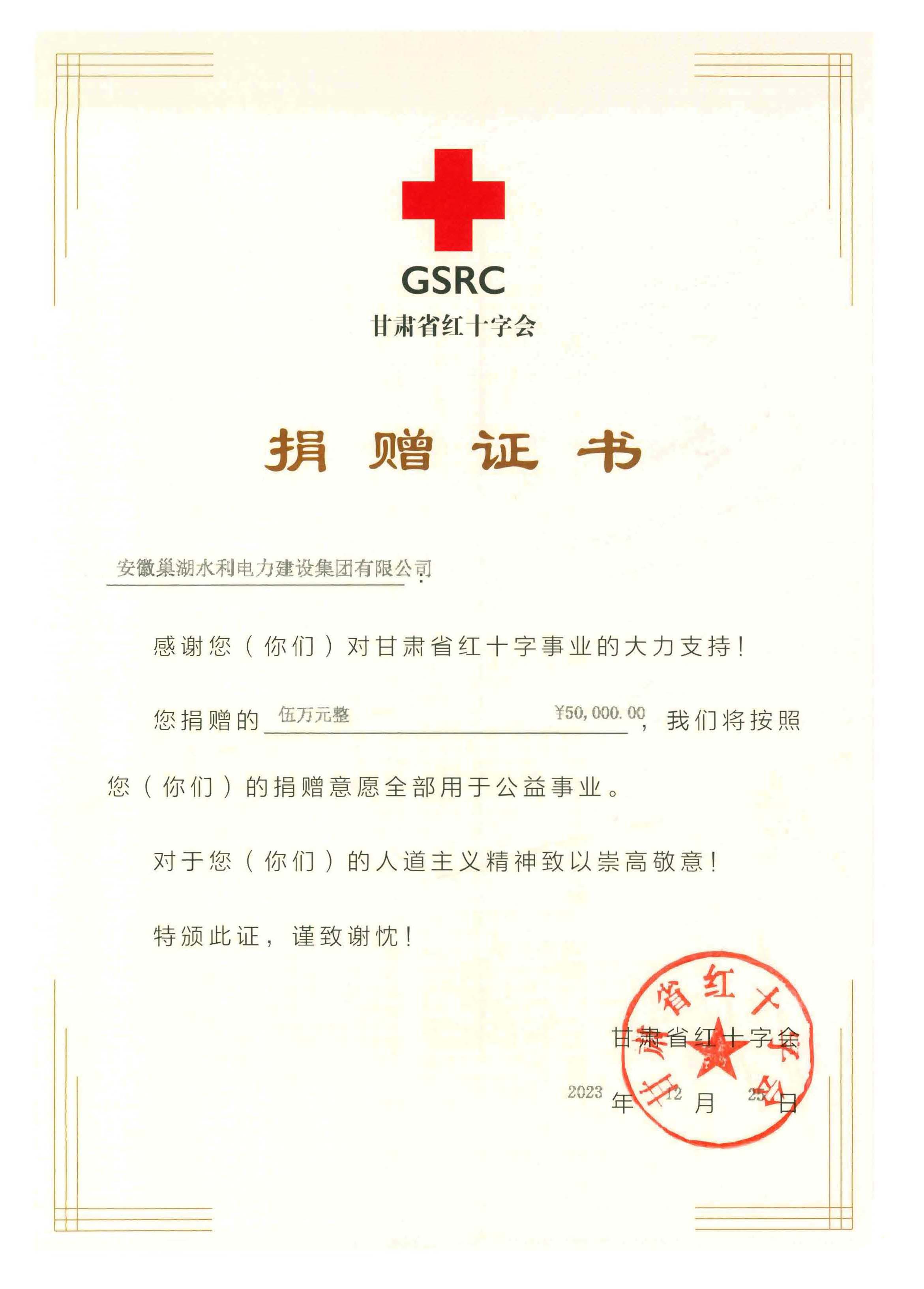 為支持災區人民抗震救災,安徽巢湖水利電力建設集團有限公司第一時間發出倡議書,號召廣大黨員干部、職工積極捐款,充分履行企業責任擔當。12月22日上午,安徽巢湖水利電力建設集團有限公司舉行向甘肅地震災區捐款活動,公司領導帶領全體員工積極參加捐款,大家同心協力、眾志成城,將愛心奉獻給災區人民。在此次活動中,公司和黨支部分別捐款5萬元和1萬元,捐款將通過甘肅省紅十字會及時送到交區人民手中,幫助災區人民共渡難關。12月25 日公司收到了來自甘肅省紅十字會分別向公司和公司黨支部發來2本捐贈證書。千言萬語繪制成一紙證書,記錄安徽巢湖水利電力建設集團有限公司全體員工與受災群眾風雨同舟、團結一心、共克災情。希望我們每個人的微小之力,積水成淵,用我們的愛心溫暖了這個冬天。