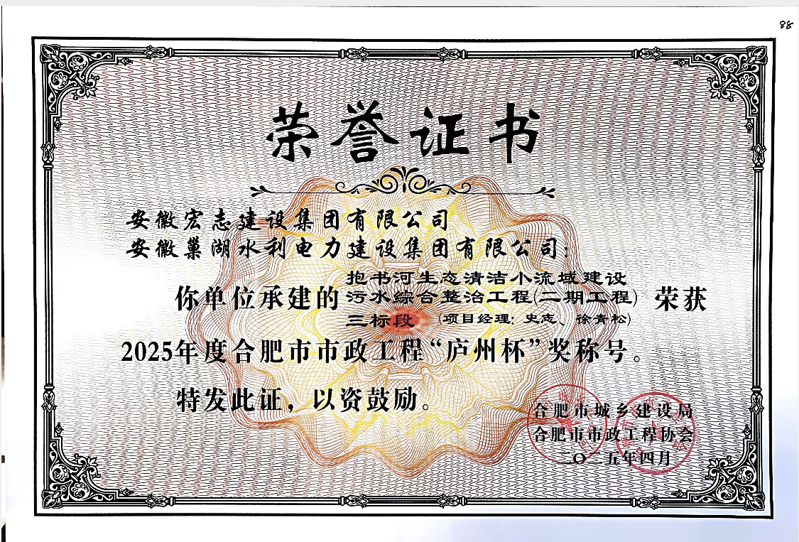 抱書河生態清潔小流域建設污水綜合整治工程(二期工程)三標段榮獲“廬州杯”證書